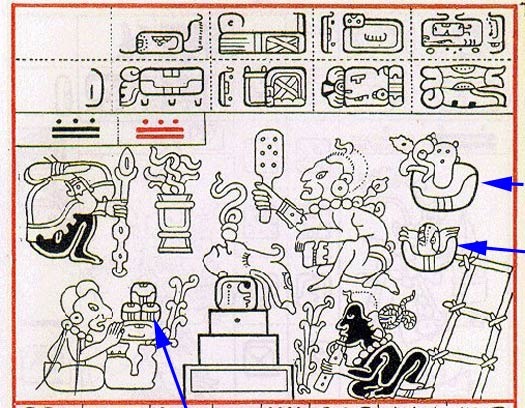 Imagen 1 En esta imagen del Códice Dresde (Pl.34) podemos observar de izquierda a derecha: Un plato con tres tamales, un solo tamal de pavo (arriba) y un tamal de iguana (abajo)